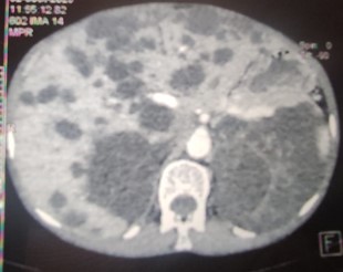 Figure 1: Axial CT scan image of the abdomen revealing a polycystic liver.