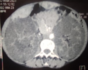 Faced with the observation of hepatomegaly and abdominal distention on clinical examination, an abdominal CT scan was requested. Thus, we were able to objectify polyrenal hepatocellular cystic disease (Figures 1 and 2).