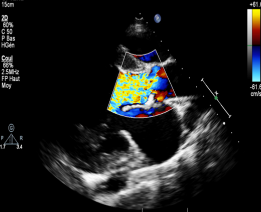 The ETT objectified a bicuspid aortic valve type 0, with severe aortic leakage: vena contracta at 8 mm, an ORS at 50 mm2 and a regurgitating volume (RV) at 80 ml; a dilated left ventricle with a telediastolic diameter at 64 mm and an LVEF at 60%; a left atrium dilated at 25 cm². The ascending aorta is undilated measured at 30 mm (Figures 3 and 4).