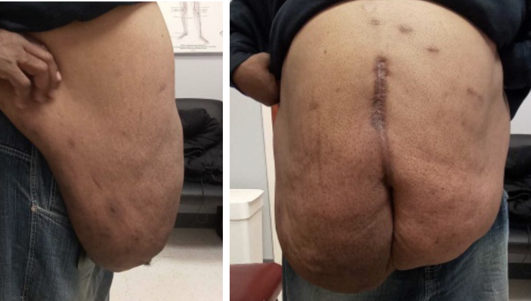 A 60-year-old morbidly obese African American male patient was referred for a bariatric consult by his primary physician. Two years ago, he had laparoscopic adjustable gastric banding (lap band) due to morbid obesity. After the intervention, his BMI remained high, and he still had severe medical problems due to his comorbidities, including hypertension, hypercholesterolemia, diabetes, arthritis, emphysema, sleep apnea, cardiomyopathy, and aortic sclerosis. His surgical history included arthroscopic knee procedure, laparoscopic cholecystectomy, and an incarcerated open recurrent incisional hernia repair. On physical examination, he had abundant abdominal fat, which aggravated his chronic conditions and limited his mobility. His functional status was significantly impaired by the pannus, which resulted in hygiene problems, limited activity, and emotional discomfort in social settings. On follow-up visits, the patient complained of a painful intertrigo with fungal infections, physical and emotional distress significantly impacting his daily life. The patient reported pain and limitation, such as in routine activities (walking, hygiene, and sleeping), prompting him to seek surgical intervention.
