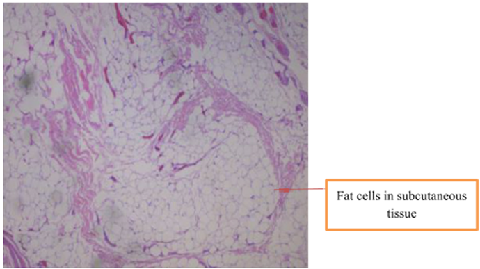 The procedure was uneventful. The pannus biopsy showed chronic inflammation, vascular congestion, and the presence of inflammatory cells in the epidermis and dermis, as seen in Figure 2, which highlights the inflammatory process. The adipose tissue was examined under histological analysis, and Figure 3 illustrates some fat cells in the tissue. This biopsy finding was significant because the chronic inflammation and tissue destruction in the panniculus produced the patient's chronic signs of skin irritation, potential for infection, and restricted mobility. This tissue had to be removed to improve both his overall physical health and reduce cardiovascular risks due to his excess fat in the abdomen. The patient was discharged after surgery on the same day with an abdominal binder and provided with written and verbal discharge instructions.