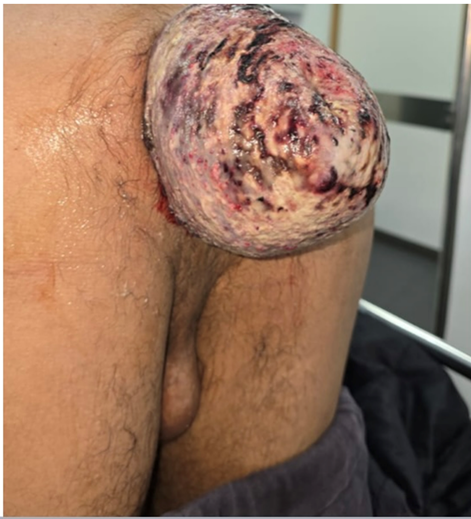 Figure 1: Clinical presentation: irreducible rectal prolapse with signs of edema and necrosis.