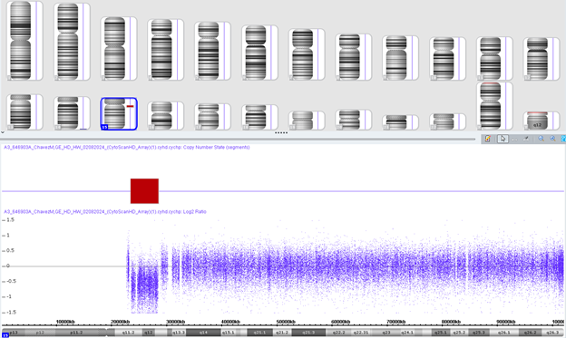 Top: Karyoview; Bottom: Log2 Ratio. Chromosome 15 and the deleted region are highlighted. The analysis identified a 5,040 kbp loss at 15q11.2q13.1: arr[GRCh38] 15q11.2q13.1(23375007_28414892)x1. This region encompasses multiple genes, including GOLGA6L2, MIR4508, MKRN3, MAGEL2, NDN, PWRN4, PWRN2, PWRN3, PWRN1, NPAP1, SNHG14, SNRPN, SNURF, SNORD107, PWARSN, PWAR5, SNORD64, SNORD108, PWAR6, SNORD109A, SNORD116-1 to SNORD116-30, IPW, PWAR1, SNORD115-1 to SNORD115-48 , PWAR4, SNORD109B, UBE3A, ATP10A, MIR4715, ATP10A-DT, LINC02346, LINC00929, GABRB3, GABRA5, GABRG3, GABRG3-AS1, OCA2, HERC2, GOLGA6L24, and GOLGA8F.  The paternal and maternal expressed genes are indicated in blue and red, respectively.