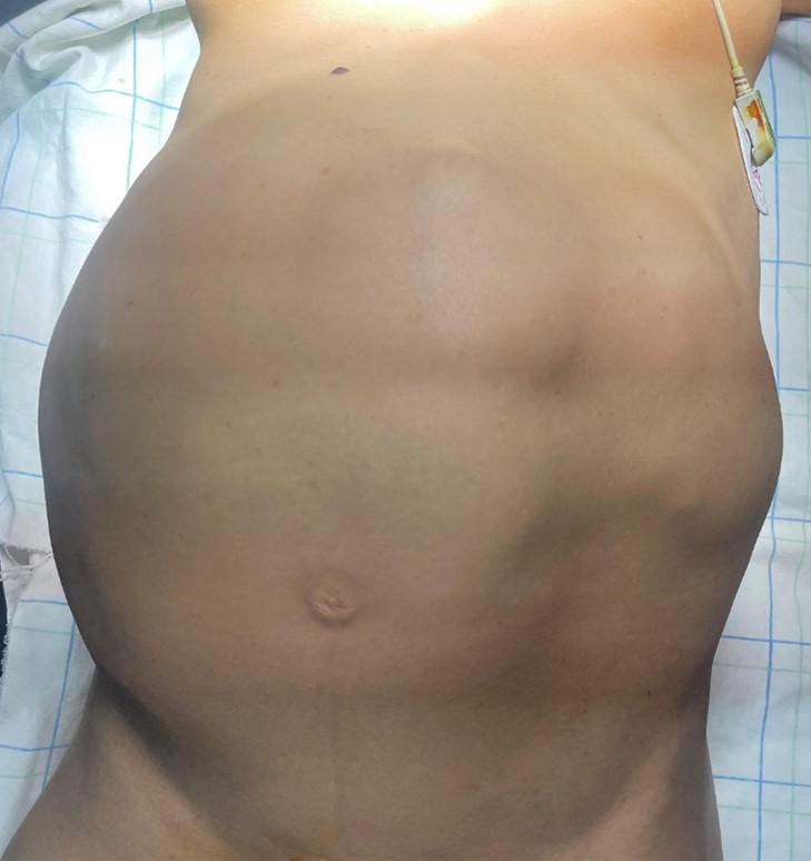Figure 1: image of the patient abdomen, showing a multilobulated mass occupying nearly all abdominal quadrants. The patient presented with an abdominopelvic CT scan showing.