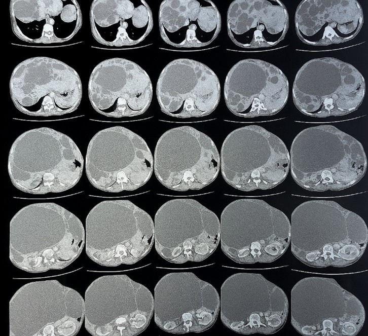 An enlarged liver (measuring 20 cm in craniocaudal height), with irregular contours and homogeneous enhancement after contrast administration. The liver harbored multiple cystic lesions (more than 10), involving all hepatic segments. These lesions were round to oval, fluid-filled, with thin walls, no post-contrast enhancement. Some contained septations, and others showed peripheral calcifications. No communication with the biliary tract was noted.