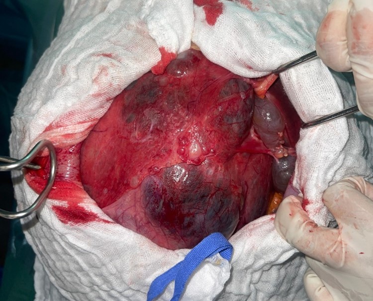 Intraoperative exploration revealed an enlarged liver extending to the left hypochondrium, containing multiple cysts, the largest of which occupied the entire right lobe of the liver, displacing the digestive structures (stomach, duodenopancreatic loop, transverse colon, and small intestine) towards the left side. The spleen appeared normal.