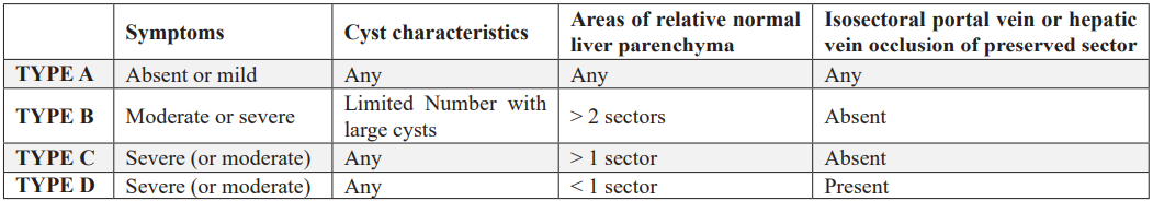 On the other hand, the Schnelldorfer classification outlines four distinct types. Type A includes patients with no or only mild symptoms, regardless of cyst size. Type B features moderate to severe clinical symptoms with a mixture of large and small cysts and significant preserved parenchymal regions. In type C, symptoms are severe, with large and small cysts present and a marked reduction in healthy liver tissue. Type D also involves severe symptoms, but with extensive cystic involvement and very limited remaining normal parenchyma [7].
