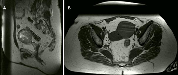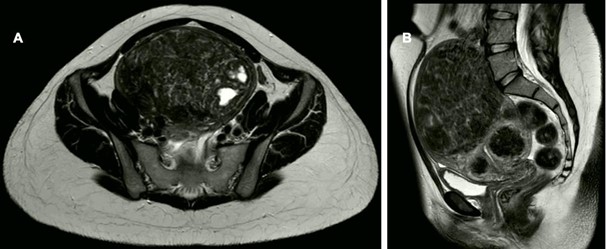 Figure 1: Radiologic findings in the 1st case. Large uterine fibroid (uterus myomatosus) without signs of infiltration. No pathological lymph nodes. Bilateral cystic ovaries.