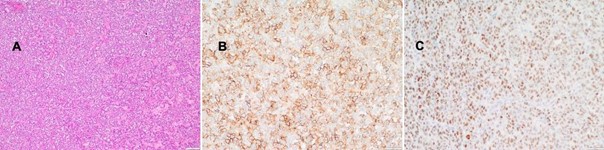 Figure 2: Histopathologic finding in the 1st case A Diffuse proliferation of epitheloid cells with clear cytoplasm and hyaline stroma; HE staining, magnification x40. B The tumor cells show heterogenous (membranous) staining with anti-CD56; magnification x200. C A large fraction of the PEComa cells are positive for anti-estrogen receptor (nuclear staining); note the mild nuclear atypia; magnification x200.
