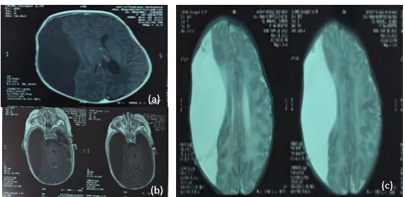 Cranial ultrasound, CT (Figure 1), and MRI (Figure 2) demonstrated a large right fronto-temporo-parietal extra-axial cystic lesion with significant mass effect and midline shift. Laboratory results were normal.