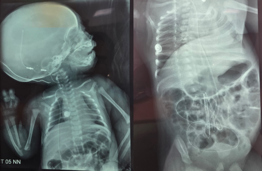 Figure 3: Standard radiographs, including frontal skull, chest, and abdominal views, confirming correct placement of the catheter.