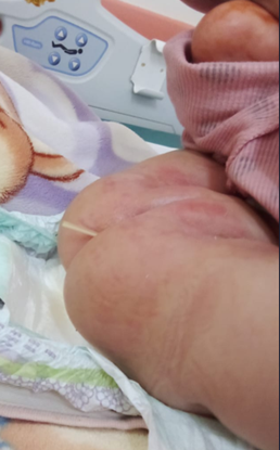Figure 4: Clinical photograph showing distal migration of the Cystoperitoneal shunt catheter, exteriorized through the anal orifice in a pediatric patient.
