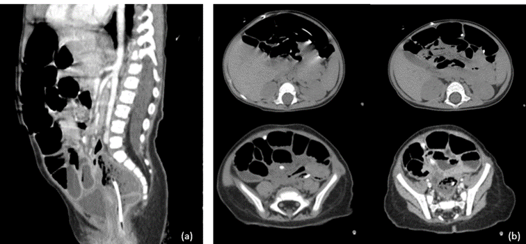 Figure 5: Abdominal CT scans demonstrating the distal cystoperitoneal catheter. (a) Sagittal view showing the catheter within the sigmoid colon. (b) Axial view confirming intraluminal migration of the catheter into the rectum.