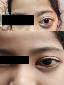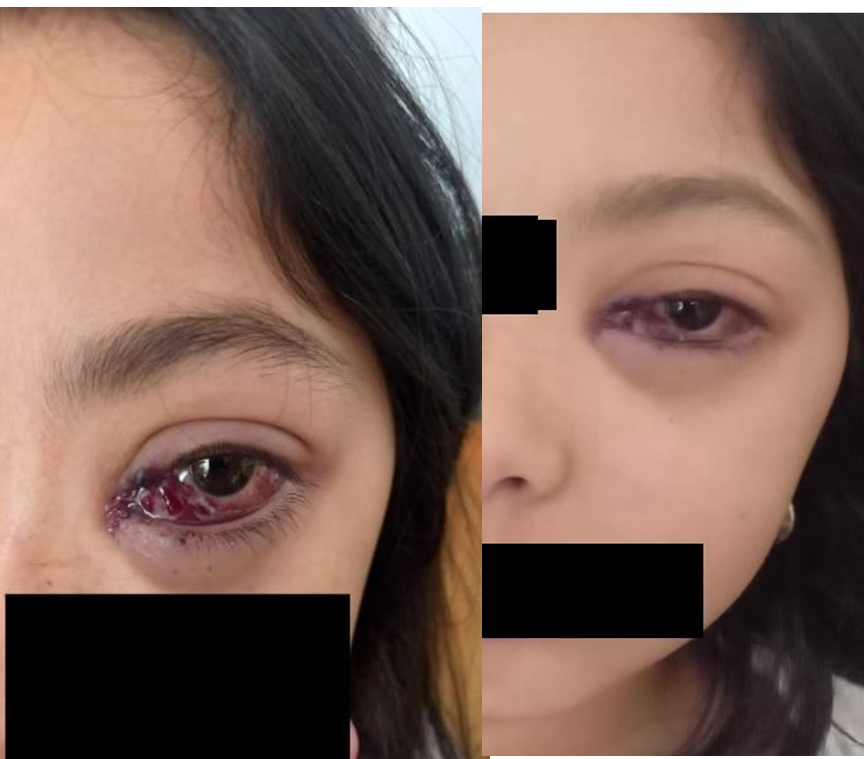 Figure 1: Inner punctate haemorrhaging in the left eye, accompanied by proptosis and subconjunctival haemorrhaging. Note the slight lateral eye dystopia and facial dysmorphia.