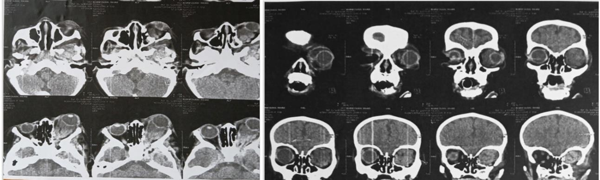 Figure 2: Large orbital heterogenous lesion in the intraconal space with proptosis of the left globe and hemimandibular dysmorphia.