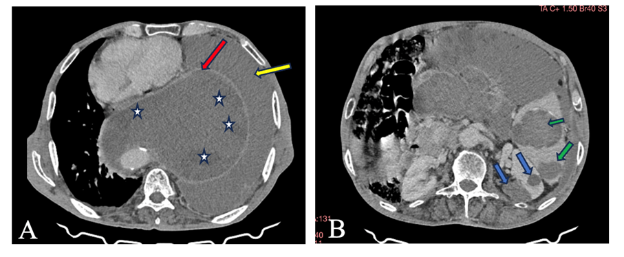 The postoperative course was initially stable under albendazole therapy and supportive care. However, the patient’s condition progressively deteriorated within a few days, with the onset of persistent fever, increasing dyspnea, and signs of septic shock. Despite intensive management in the intensive care unit, including broad-spectrum antibiotics and hemodynamic support, the patient developed multiorgan failure. Unfortunately, he passed away ten days after surgery due to septic complications related to the extensive dissemination of the hydatid disease.