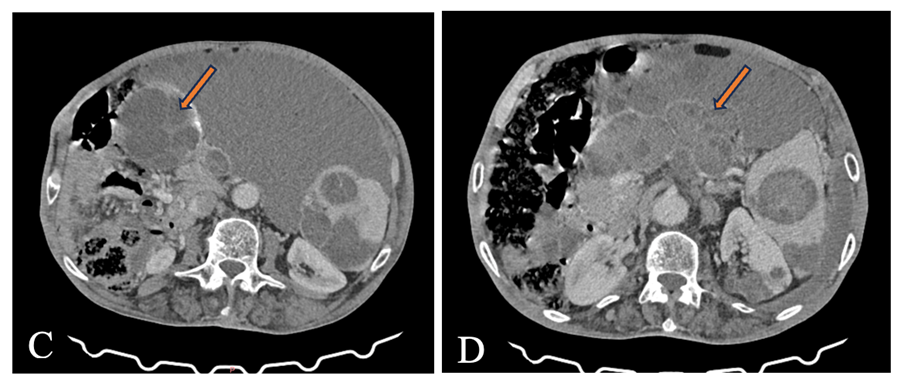 Figures: Abdominal CT scan with contrast injection, showing multiple intraperitoneal cystic formations in the right flank (Figure C) and the antro-pyloric region (Figure D).