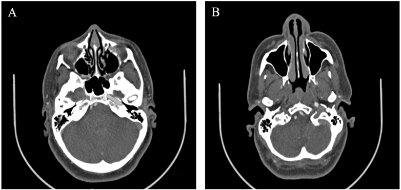 Figure 2: Axial CT scan of the base of the skull showing the absence of the right carotid canal (A). No opacification of the right internal carotid artery (B).