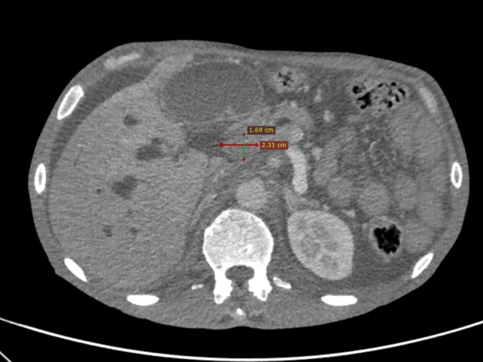 Figure 2: CT chest and abdomen showing poorly-defined ampullary mass with dilatation of the biliary channels.