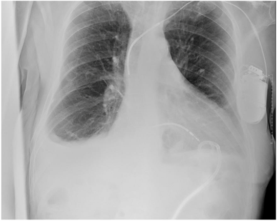 Figure 1: Chest radiography in anteroposterior projection. There is cardiomegaly and bilateral pleural effusion without condensation images.