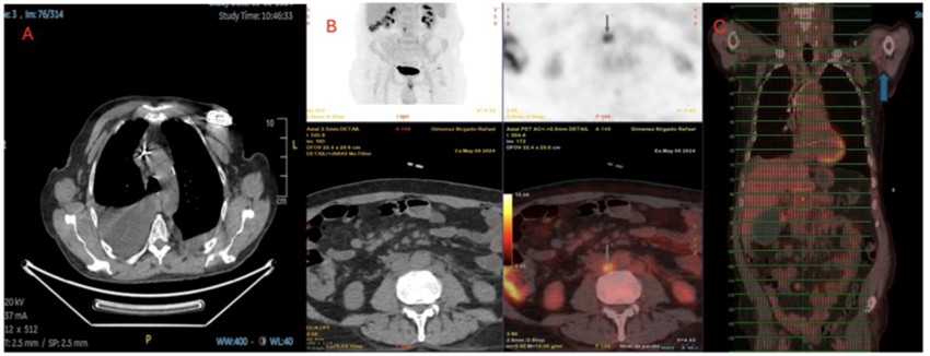 Figure 3: PET-CT. A) Axial view of the lung window reveals the presence of a larger and more extensive pleural effusion on the right side, with no metabolic activity. B) Axial view of the abdomen window reveals several lymph nodes, notable for their size and metabolism, located in the inter-aortocaval area. C) Significant metabolic uptake at the level of the left axillary lymph node.