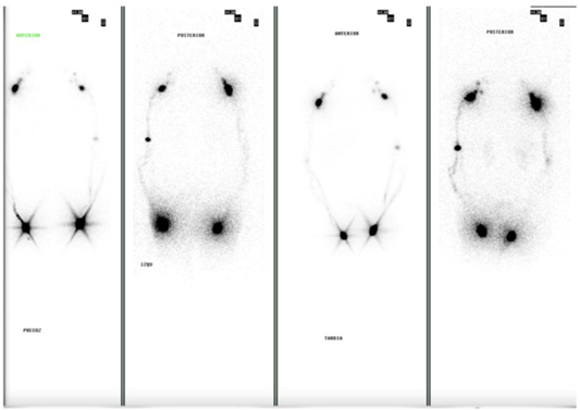 Figure 4: Lymphoscintigraphy. Physiological distribution with early tracer migration and evidence of deep lymphatic vessels with absence of subcutaneous migration.