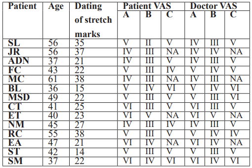 Table 1: Patients with stretch marks less than 20 years old, subjected to 9 weekly sessions.