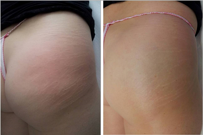 Another feature that we have observed is given by the overlapping of the results found in the two groups of patients, the first with striae up to 20 years old (16 patients) and the second with striae over 20 years old (14 patients). Similar results were also verified considering the phototype of the patients which varied from II (8 patients), III (16 patients), IV (3 patients) up to V (3 patients). To obtain similar improvements, it was necessary to perform 12 sessions for the streaks older than 20 years instead of 9, as required for the streaks of lesser age. The therapy was appreciated for the total absence of side effects and downtime; even sun exposure immediately after the therapies did not determine any negative outcome. The patients, specifically questioned in this sense, evaluated the therapy as extremely pleasant and relaxing. All the patients, without exception, expressed a high level of comfort during the cycle of sessions. Pleasant effects not expected at the time of starting this study we have observed are an evident remodeling of the glute, which appears more toned, lifted, and reshaped and at the same time a reduction of cellulite in patients also affected by this pathology. This was immediately noticed by the patients and then confirmed on all the patients also by the doctors. The lack of preliminary adoption of a specific scale to evaluate these unexpected results prevents us from assigning a numerical value to the improvement, but we can affirm that it is evident on all the patients and is relevant on at least 50% of them.