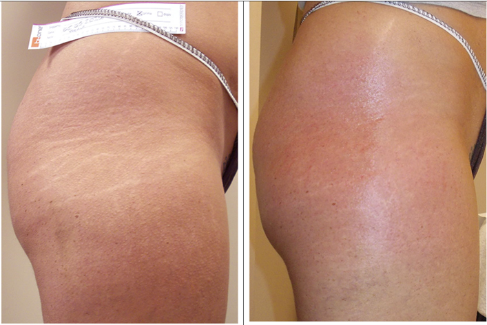 Figure 2: 31-year-old patient with 14-year-old stretch marks from her developmental period. In the photo on the left, taken before the cycle of 9 weekly treatments, you can see obvious white streaks. After the cycle of sessions, as you can see in the photo on the right, the stretch marks are regenerated and perfectly tanned with sun exposure. The shape of the glute has also improved, with greater relief compared to the profile of the thigh.