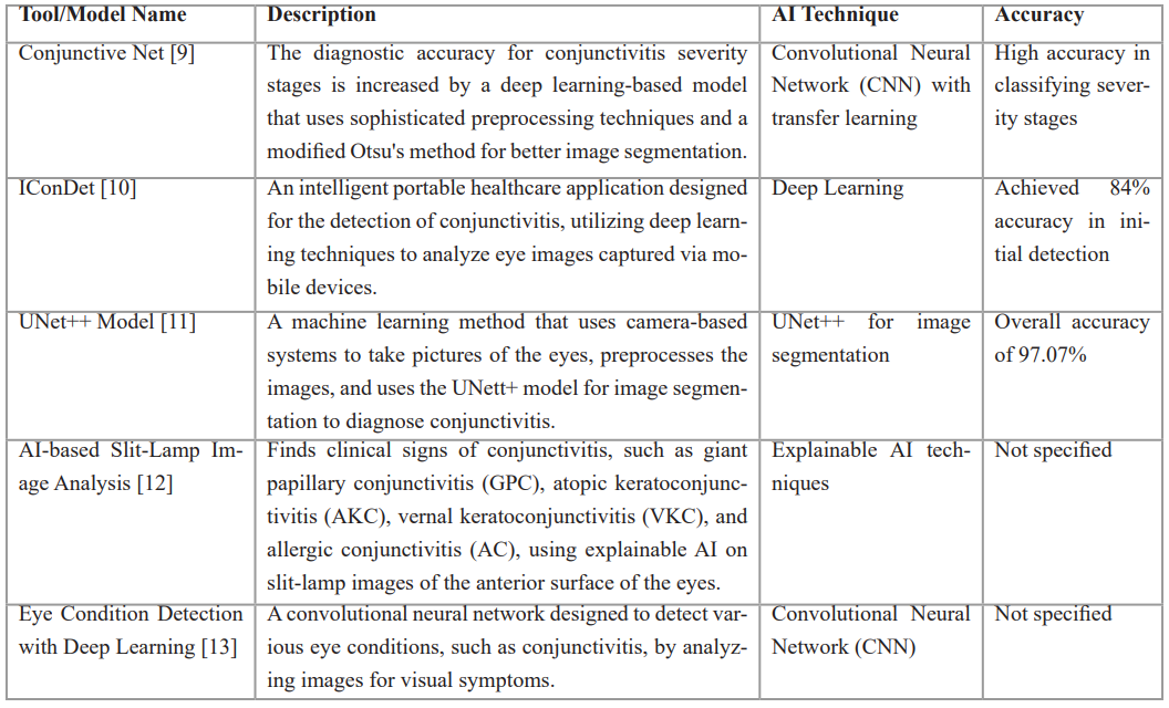 Table 1: AI tools designed for conjunctivitis diagnoses and management.