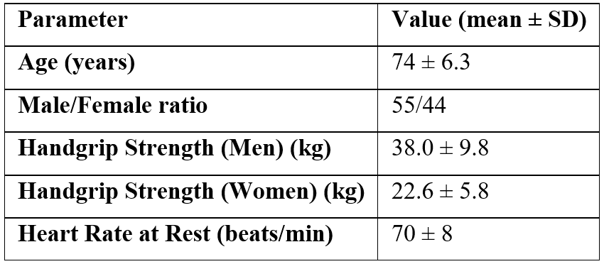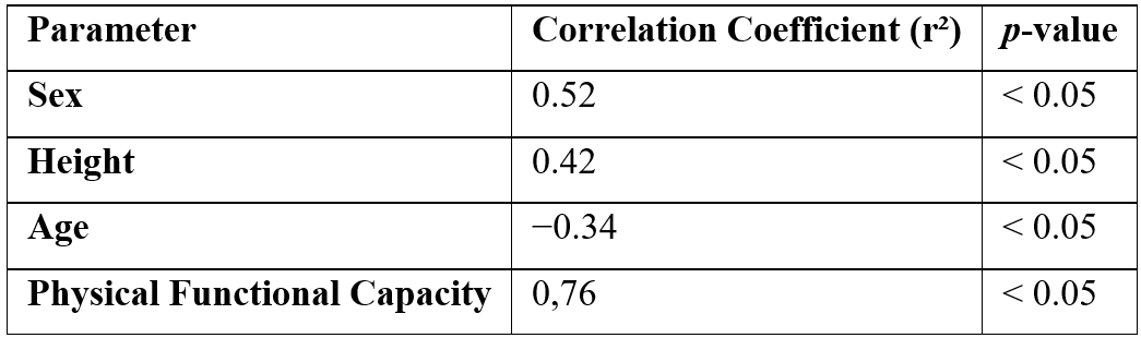 Handgrip strength was significantly greater in men than in women (38 ± 9.8 kg vs. 22.6 ± 5.8 kg, p <0.05), but declined with age in both sexes. The strongest correlates of maximal handgrip strength were sex (r² = 0.52, p <0.05), height (r² = 0.42, p <0.05), and age (r² = −0.34, p <0.05). Baseline strength was associated with physical functional capacity in individuals over 60 years of age. Increased grip strength correlated with higher functional class (r² = 0.76, p <0.05). (Table 2)