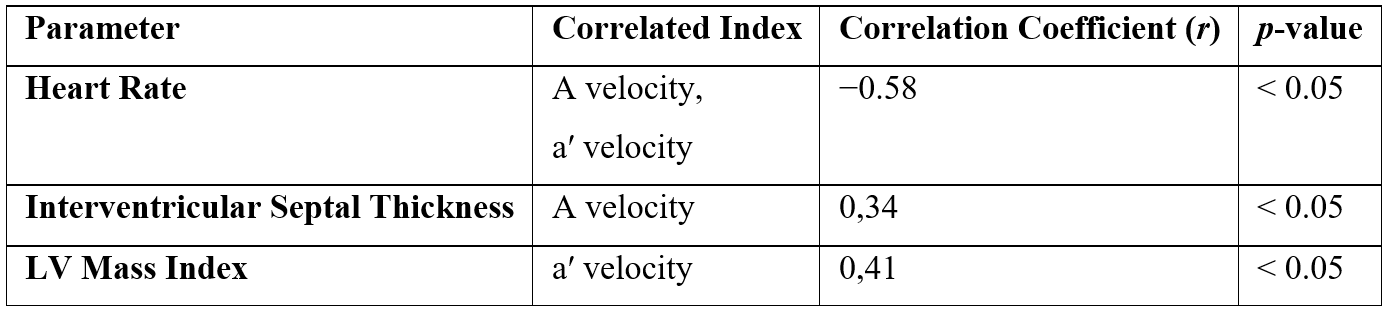 At rest, a reduced E/A ratio and elevated A and a′ values reflect increased atrial contribution to LV filling. Tissue Doppler parameters (e′, a′, E/e′) demonstrated changes under stress, suggesting compensatory myocardial involvement. Changes in echocardiographic parameters correlated with heart rate, septal thickness, and LV mass index, supporting their clinical relevance (Table 4).