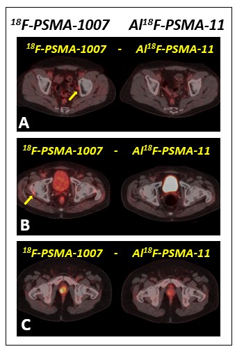 Figure 2: Axial PET CT images of three different prostate cancer patients showing metastasis in pelvic lymph node (A) and right femoral head (B) (yellow arrows) demonstrated only by means of 18F-PSMA-1007, and coincident prostate relapse (C). Note the better contrast and uptake intensity of 18F-PSMA-1007.