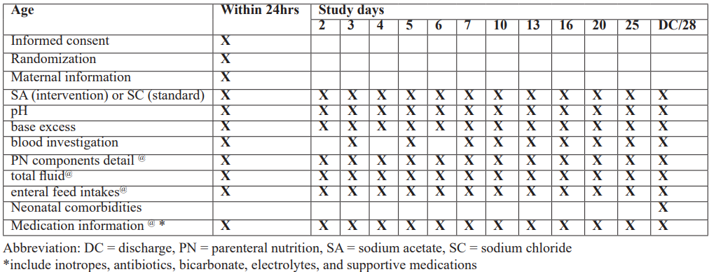 Methods and timing for assessing, recording, and analyzing efficacy parameters: The data collected will include maternal and infant demographics, blood investigation reports, and clinical outcome results. The primary outcomes will be assessed from pre-PN on the first day of life (DOL), then 2– 7 DOL, and days 10, 13, 16, 20, 25, and 28 of life irrespective of the duration of PN therapy. Blood sampling techniques will include using either an in-dwelling arterial catheter or capillary sampling. For day 1 of PN therapy samples, the latest blood gas within 6-12 hours of PN initiation will be used. In the case of several samples being taken on the following days, the first recorded value will be taken before the nursing staff's morning shift transfer to standardize the sampling times. The daily doses of So-A in the PN will be adjusted by the PN processing pharmacist according to the patient’s daily serum levels, and the same pharmacist will maintain the data for it.