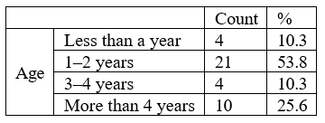 An evaluation of the demographic features of the study sample revealed that most of the patients were 1–2 years old (n = 21, 53.8%), followed by those who were more than 4 years old. Patients aged 3– 4 years (4, 10.3%) and less than a year old (4, 10.3%) had the least frequency (Table 1).