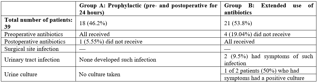 Group A comprised 18 patients who received either a single preoperative antibiotic dose or antibiotics for up to 24 hours postsurgery, with just one patient in the former category. Group B consisted of 21 patients: 17 received preoperative antibiotics plus extended antibiotics, and 4 initially did not receive preoperative antibiotics but were given extended therapy (Table 2).