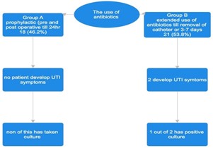 We divided our cohort into two groups based on their antibiotic exposure to determine any resulting impact on postoperative infection rates. Group A represented patients who received a single preoperative antibiotic dose and those who received antibiotics for up to 24 hours. Group B comprised patients who received preoperative antibiotics plus extended antibiotics until the catheter was removed (3–7 days) and those who did not receive a preoperative dose but received extended antibiotics. Statistical analyses were performed using SPSS version 21. For descriptive statistics, categorical variables were summarized as frequencies and percentages. Inferential statistical methods included univariate analysis using chi-square tests to determine the association of UTIs/SSIs and a positive culture with pre- and postoperative antibiotic use. Additionally, the Kruskal–Wallis test was used to assess the relationship between age and postoperative UTIs/SSIs. Prevalence rates were calculated as percentages with 95% confidence intervals. A P-value < 0.05 was considered statistically significant.