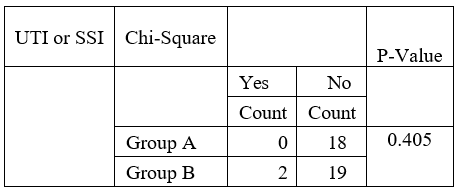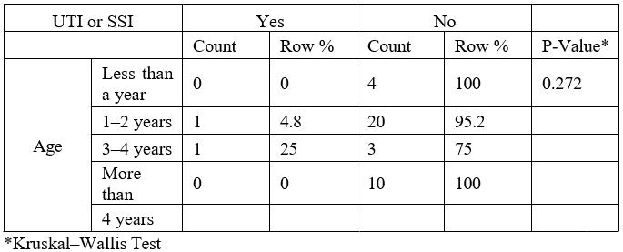 Our analysis of the association between age and incidence of UTIs and SSIs, using the Kruskal– Wallis test, did not indicate a significant difference across the age groups of the study. Of the 39 patients, none of the infants developed infections. Correspondingly, the infection rate increased slightly—4.8% (1 of 21) in the 1- to 2-year-old group and 25% (1 of 4) in the 3- to 4-year-old group—while no child older than 4 years developed an infection. For the Kruskal–Wallis test, the P-value was 0.272, confirming that there is no significant relationship between age and the development of postoperative infections. These findings thus suggest that age is not a vital factor in the development of UTIs or SSIs among these patients (Table 4).