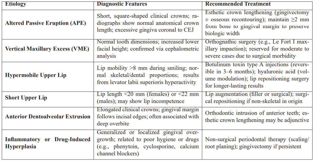 Table 1: Diagnostic indicators and recommended treatments for Excessive Gingival Display.