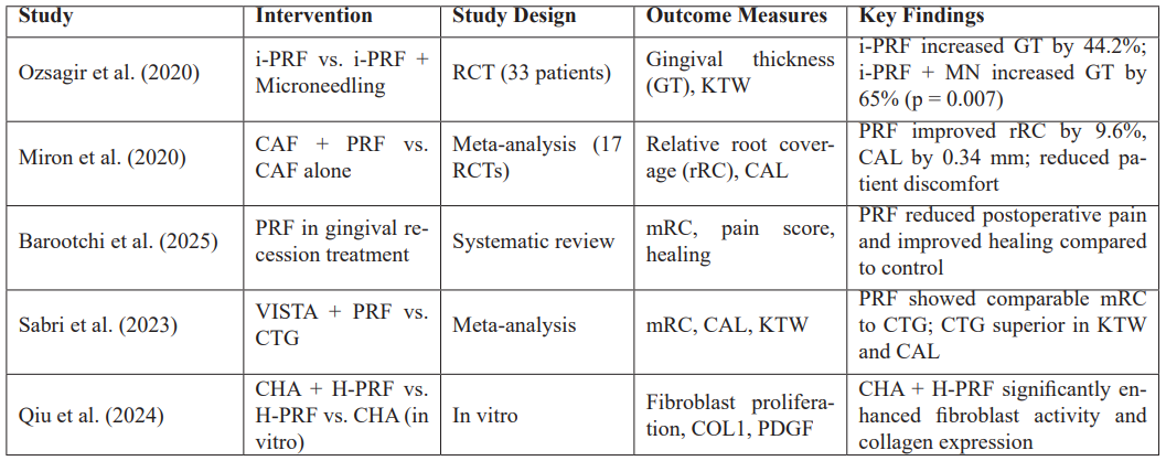 Results: PRF demonstrated consistent benefits in enhancing gingival thickness, supporting root coverage procedures, and improving wound healing. i-PRF combined with microneedling resulted in a 65.0% increase in gingival thickness over six months. When used with Coronally Advanced Flap (CAF) procedures, PRF improved relative root coverage and clinical attachment levels, though CTG remained superior for keratinized tissue gain. Notably, application of PRF to palatal donor sites during CTG harvesting was associated with significantly reduced postoperative pain and accelerated healing, enhancing patient comfort and recovery. The regenerative performance of PRF is also influenced by blood handling protocols, emphasizing the need for standardized centrifugation parameters.